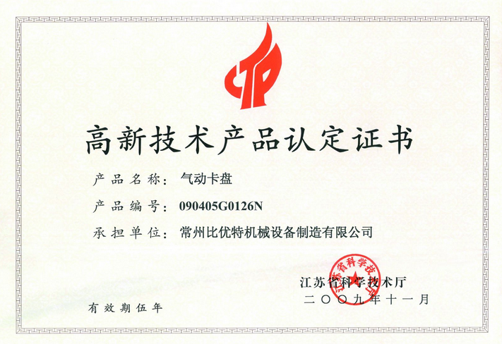 2010年12月常州“比優特”牌液壓卡盤榮獲“江蘇省高新技術產品認定證書”
