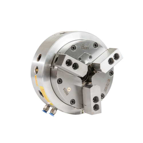 該卡盤重量輕、孔徑大、行程大、轉速高,適用于普通車床、管螺紋機床及焊接設備的配置??ūP體即為氣缸,內置活塞、逆止閥,具有超長時間的保壓功能(長達24小時以上),通過側面旋轉進氣,實現夾緊與松開動作,斷開起源,方可工作。